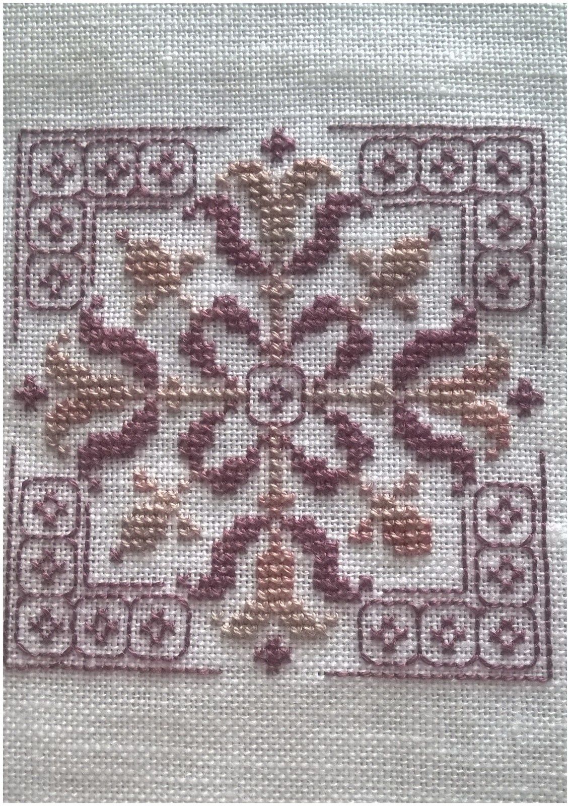 On va broder un petit carré du milieu de la toile (petit mais il a été bien laborieux pour moi!) qui ressemble un peu à ceux que l'on brode pour faire un biscornu.